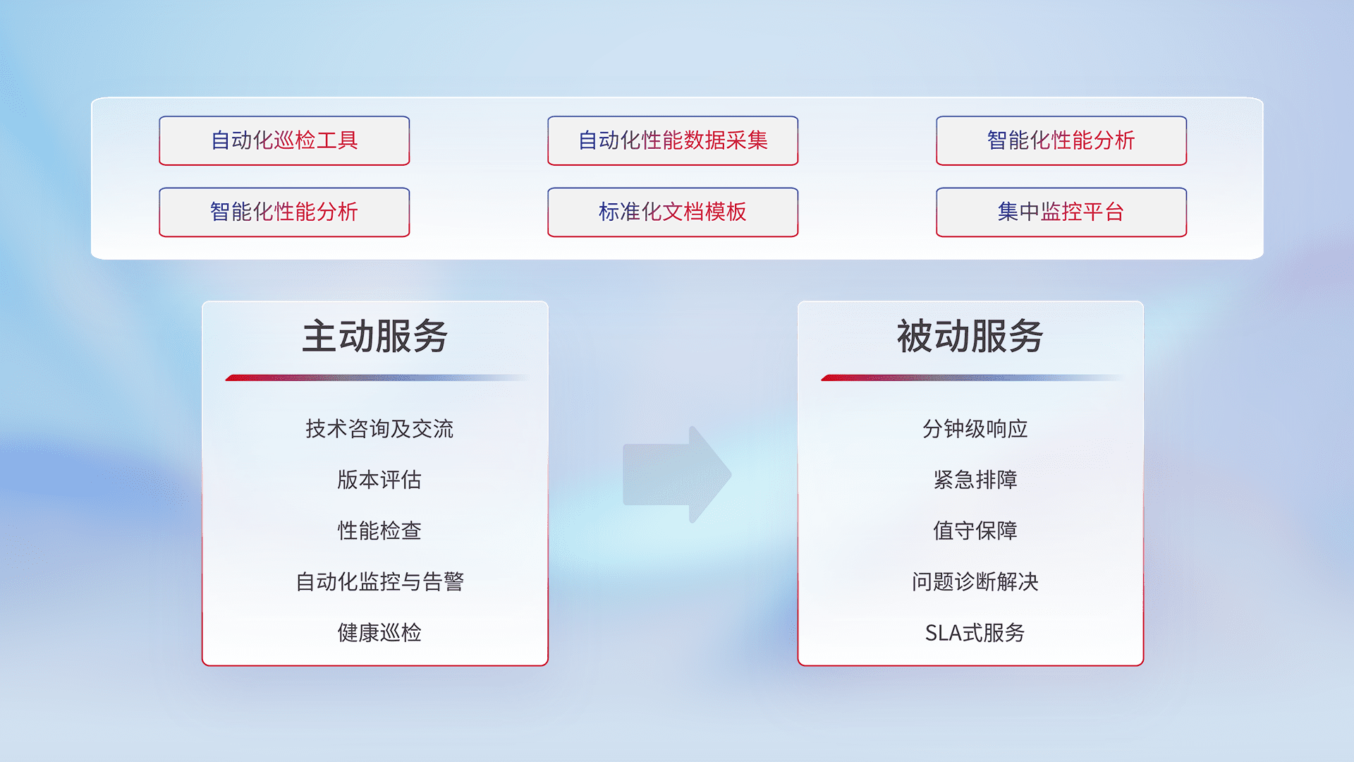 智能化工具和标准化文档,,,,保障服务质量,,,,提供主动服务(包含技术咨询、、版本评估、、性能检查、、、自动化监控与告警、、、健康巡检)和被动服务包含(分钟级响应、、、、紧急排障、、值守保障、、、问题诊断解决、、SLA服务)。。。
